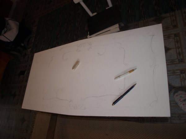 Sok-sok intarziás bútor képét végignéztem az interneten, majd azokból megalkottam a saját mintámat. Azt rajzoltam fel az asztalra.