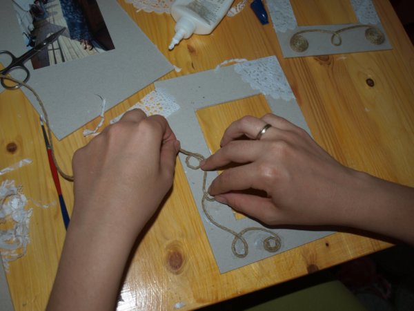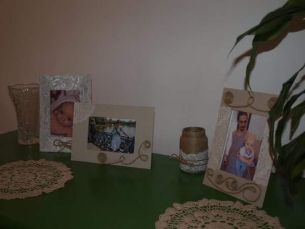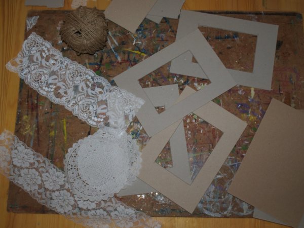 Először arra gondoltam, hogy színes kereteket készítek, elő is készítettem jó pár scrapbook papírt. De végül úgy döntöttem, hogy maradok a már bevált csipke, kenderzsineg kombinációnál. (ami már több tárolódoboznál és üzenőfalnál is bevált)