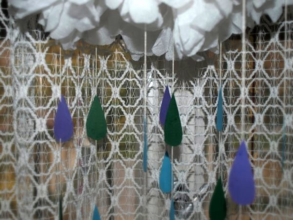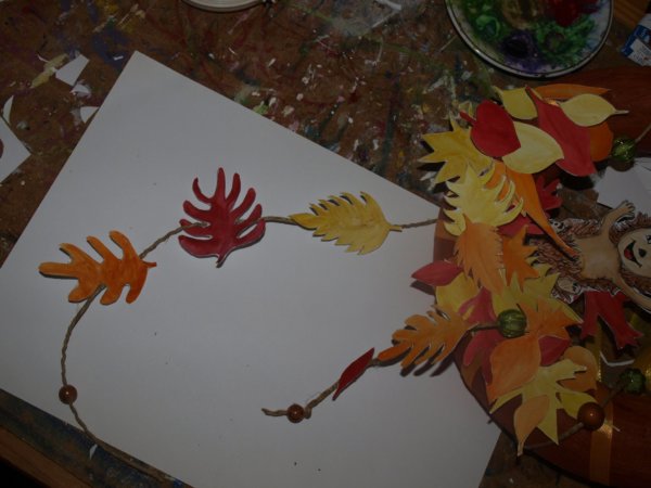 A koszorúra színes szalagot tekertem és felragasztgattam a kivágott leveleket.