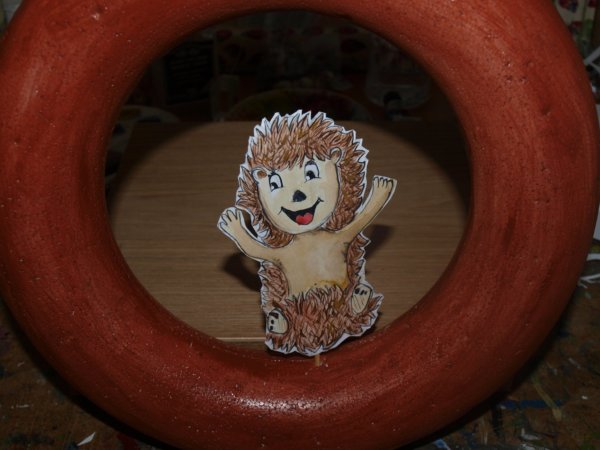 A sünit kivágtam, egy hurkapálcára ráragasztottam és a barnára festett koszorúba egyszerűen beleszúrtam.