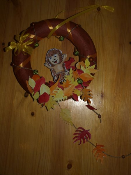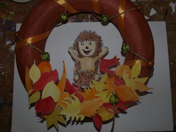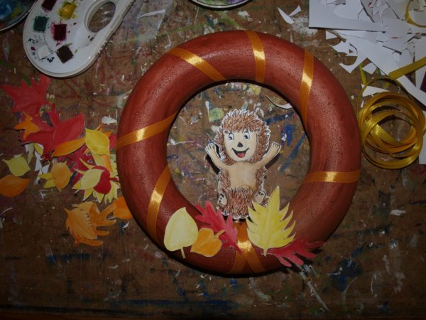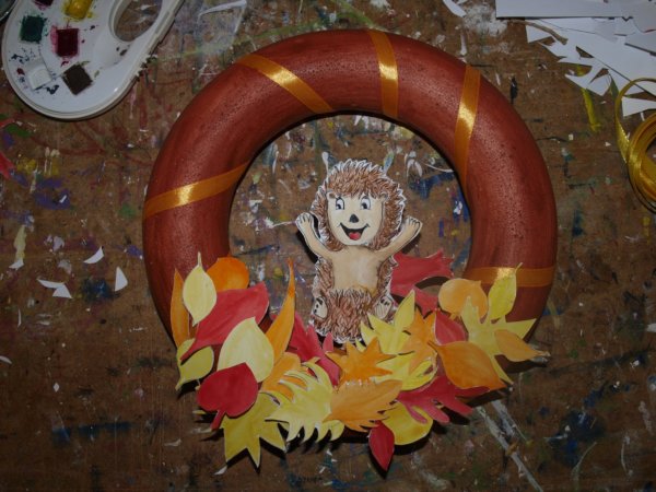 A díszítésre szánt leveleket megrajzoltam, kifestettem, ugyanúgy a koszorú főszereplőjét, a sünit. A leveleket akár színes papírból is ki lehet vágni.