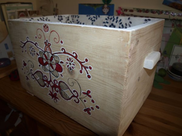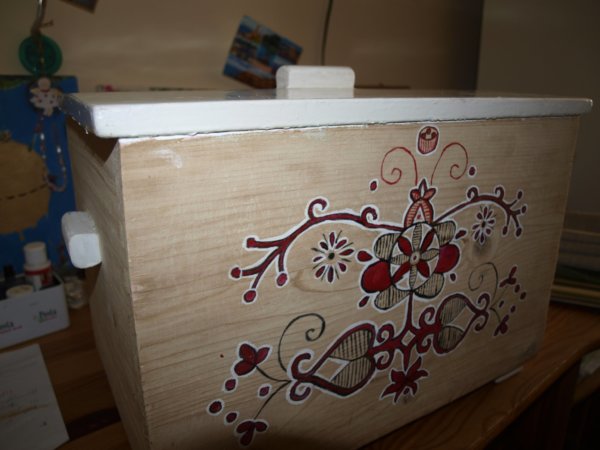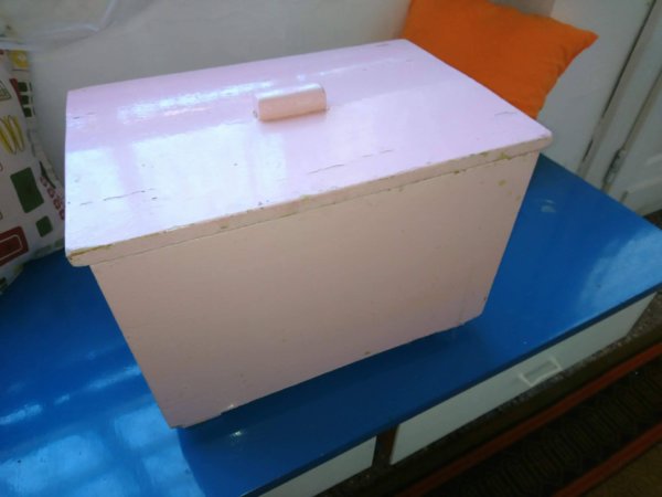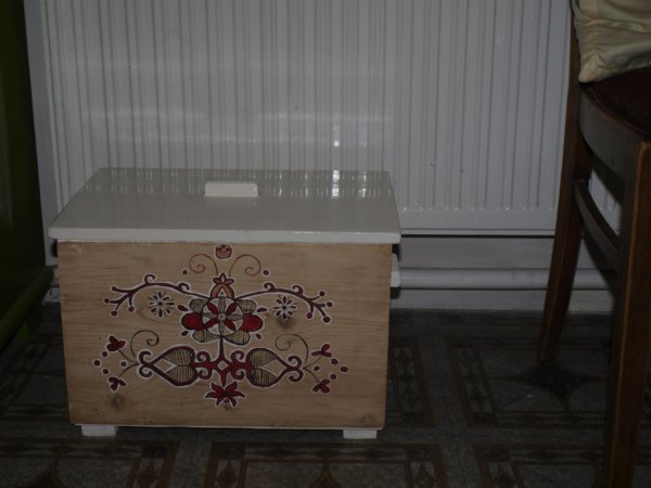 Elsőként egy régóta tolódó dolog került megoldásra. A vendégpapucsaink eddig egy zsákocskában voltak hol ide, hol oda felakasztva, de igazából helyük sosem volt. Végül a megoldás keresés nélkül érkezett : barátnőmtől kaptam egy régi ládikát, ami a nagymamájáé volt.
